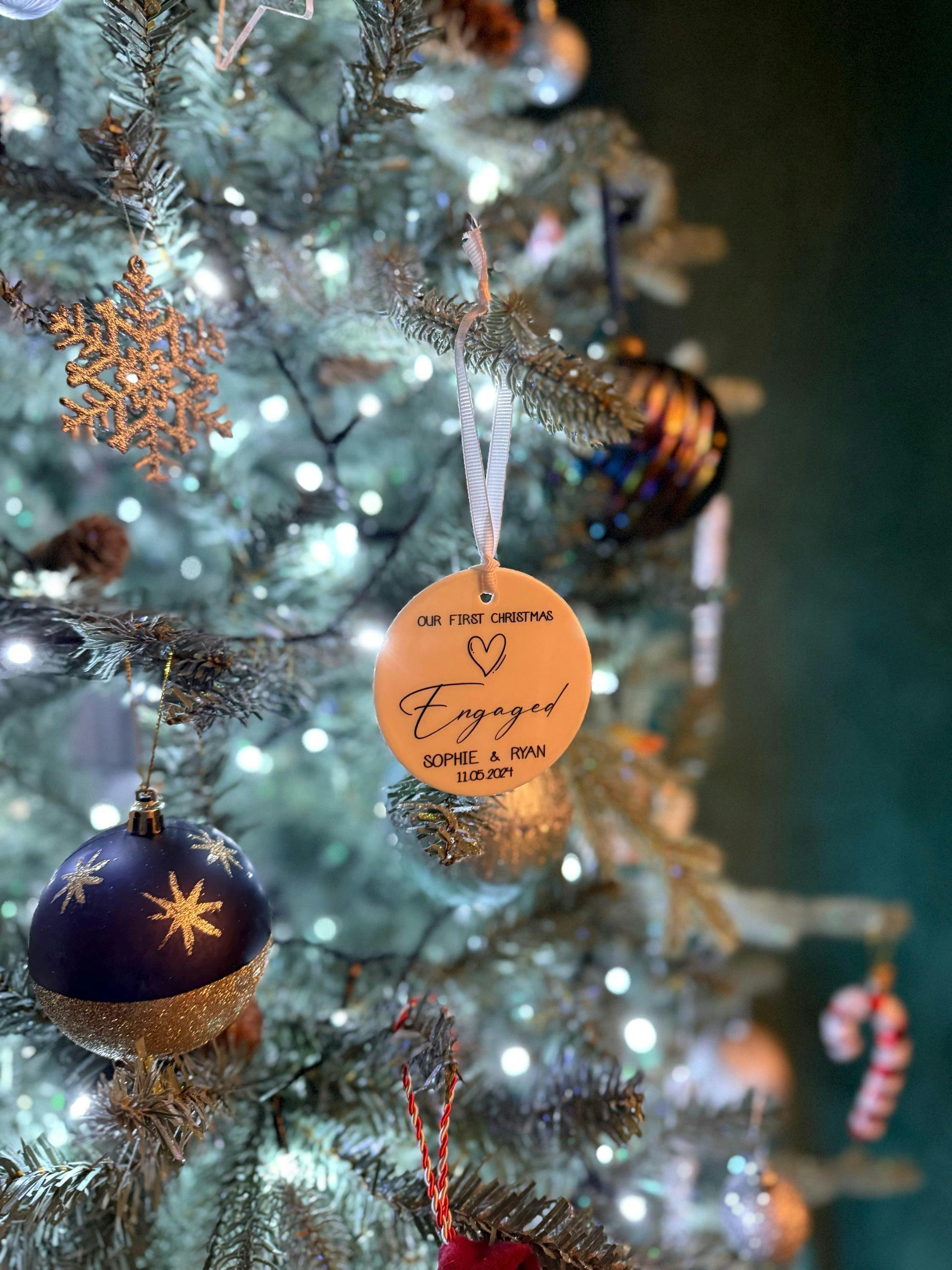 Our First Christmas Engaged Personalised Ornament is the perfect solution for couples marking their engagement in 2025. This elegant, minimalist bauble combines elegant design with durability, ensuring your special memory shines bright for years to come. The ornament offers: